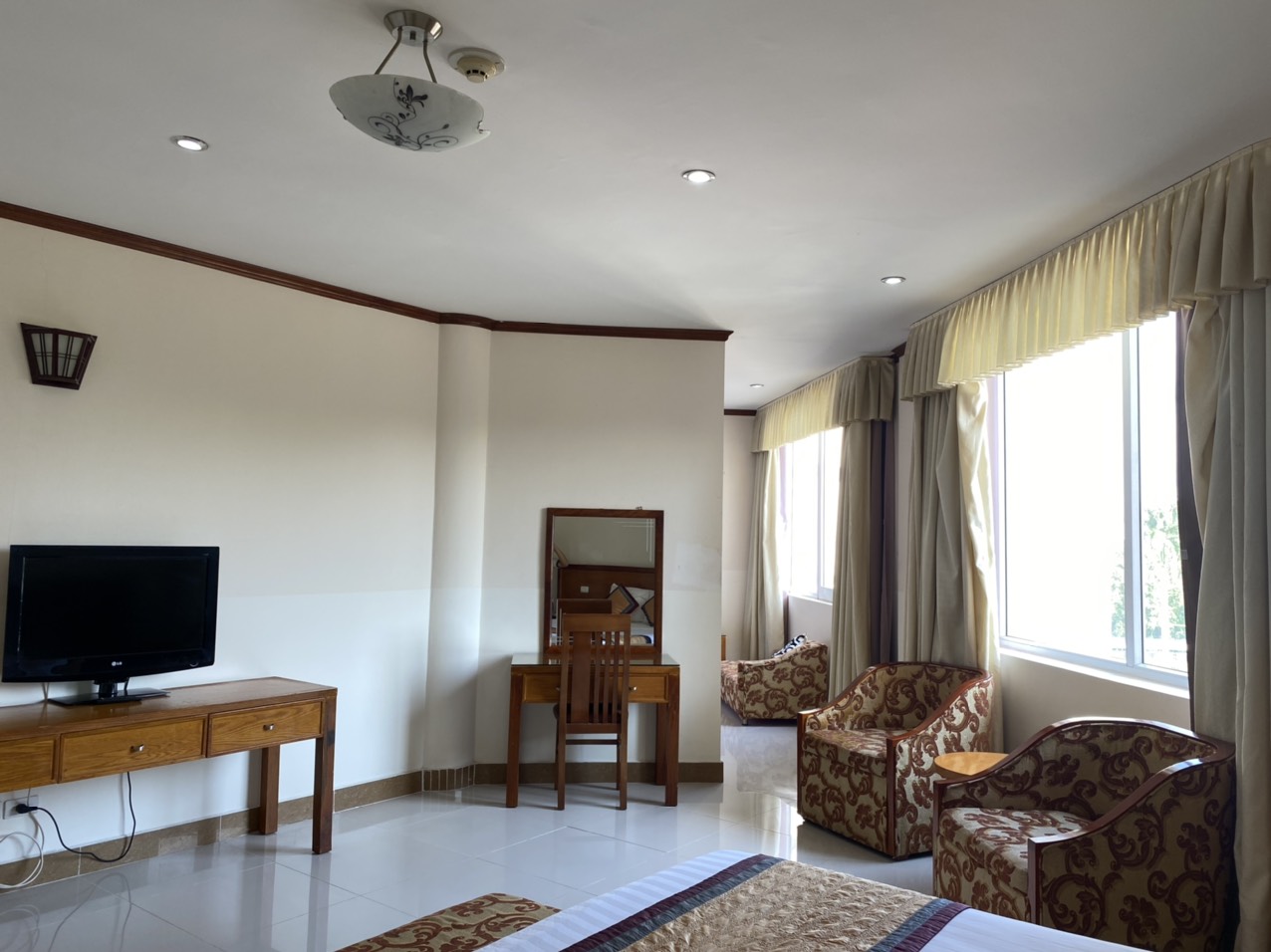 Phòng được trang bị điều hòa, tivi màn hình lớn.