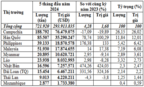 Phân bón của Việt Nam xuất khẩu chủ yếu sang thị trường Campuchia, riêng thị trường này đã chiếm trên 26% trong tổng khối lượng và tổng kim ngạch xuất khẩu phân bón của cả nước, đạt 188.792 tấn, tương đương 76,48 triệu USD, giá trung bình 405 USD/tấn, giảm 17% về lượng, giảm 19,9% kim ngạch và giá giảm 3,4% so với cùng kỳ năm 2023. Riêng tháng 5/2024 xuất khẩu sang thị trường này đạt 42.813 tấn, tương đương 17,09 triệu USD, giá trung bình 399 USD/tấn, tăng 1,3% về lượng, tăng 1,7% kim ngạch, giá tăng 0,4% so với tháng 4/2024.