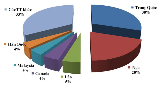 Đứng thứ 2 là thị trường Nga đạt 102,542 tấn, giá trị 57,21 triệu USD, giá trung bình 557,91 USD/tấn; giảm 15,12% về lượng, giảm 24,07% về kim ngạch và giảm 10,55% về giá; Tiếp đến thị trường Lào đạt 54,274 tấn, trị giá 13,79 triệu USD, giá trung bình 254,16 USD/tấn; tăng 9,95% về lượng, tăng 2,02% về kim ngạch nhưng giảm 7,21% về giá.