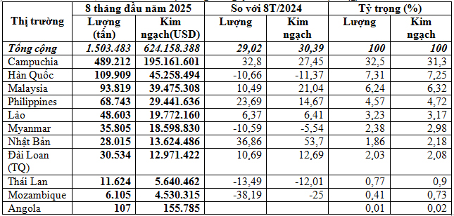 Tính chung 8 tháng đầu năm 2025, xuất khẩu phân bón đạt 1,5 triệu tấn, trị giá 624,16 triệu USD, giá trung bình 415,1 USD/tấn, tăng 29% về lượng, tăng 30,4% về kim ngạch và tăng 1,1% về giá so với 8 tháng đầu năm 2024.